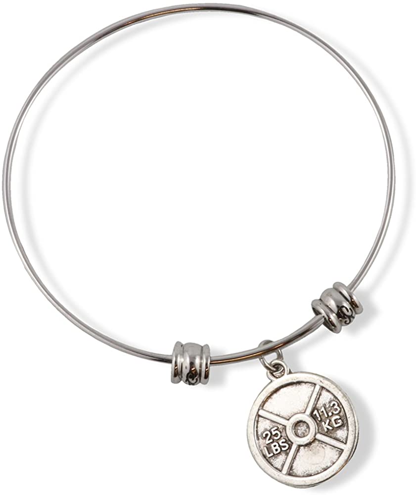 This 25 lb 11.3 kg Barbell Dumbell Weight charm bracelet is perfect for the fitness lover. A great gift for a Weight Lifter or someone who just loves 25 lb 11.3 kg Barbell Dumbell Weights. This adjustable stainless steel bangle has beautiful scrolled wrist protectors. Fashionable for any occasion and can be worn with any outfit or suit. Ready to be ordered and shipped to you by Amazon.