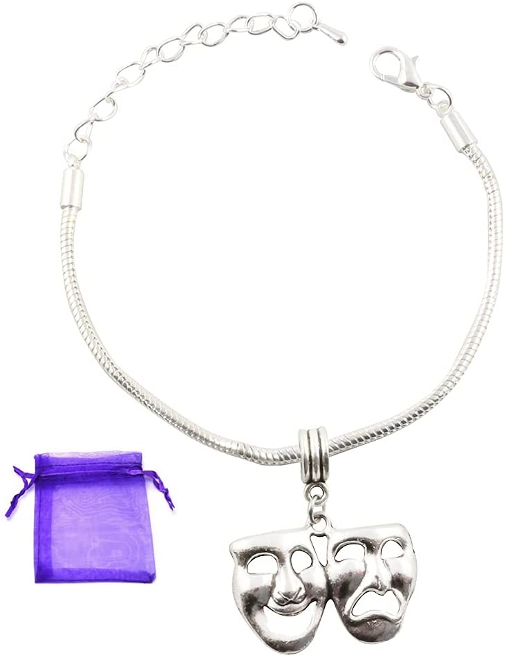 Drama Mask Bracelet | Tragedy Comedy Mask Thespian Mask Charm Bracelet Jewelry Theatre Theater Gift for Women Men Boys Girls Actors and Actress on Silver Plated Snake Chain
