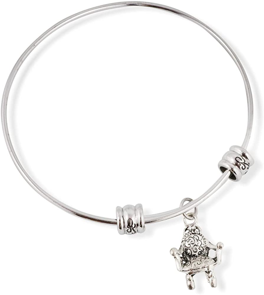 This Antique Comfy Chair charm bracelet is perfect for the furniture lover. A great gift for a student of antiques or someone who just loves Comfy Chairs. This adjustable stainless steel bangle has beautiful scrolled wrist protectors. Fashionable for any occasion and can be worn with any outfit or suit. Ready to be ordered and shipped to you by Amazon.