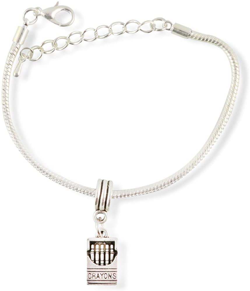 This Crayons charm bracelet is perfect for the Crayon lover. A great gift for a student of Art or someone who just loves Crayons. This adjustable Silver Plated Bracelet has a beautiful scrolled wrist protector and lobster clasp. Fashionable for any occasion and can be worn with any outfit or suit. Ready to be ordered and shipped to you by Amazon.