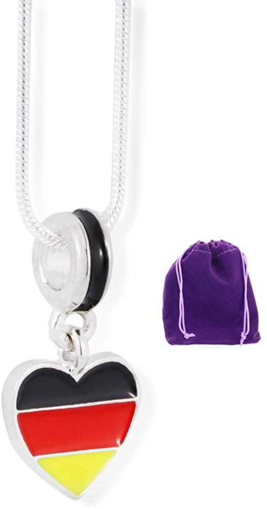 This German Flag on Heart charm necklace is perfect for the German Patriot. A great gift for a citizen of Germany or someone who just loves German Flags on Hearts. This 22 inch stainless steel necklace has a beautiful snake chain pattern and lobster clasp. Fashionable for any occasion and can be worn with any outfit or suit. Ready to be ordered and shipped to you by Amazon.