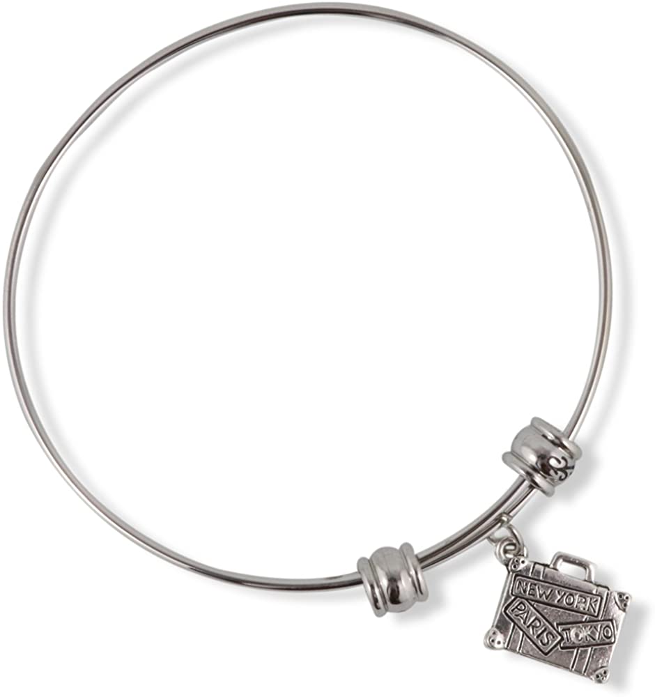 This Travel Luggage Suitcase charm bracelet is perfect for the travel lover. A great gift for a student of travel or someone who just loves Travel Luggage. This adjustable stainless steel bangle has beautiful scrolled wrist protectors. Fashionable for any occasion and can be worn with any outfit or suit. Ready to be ordered and shipped to you by Amazon.