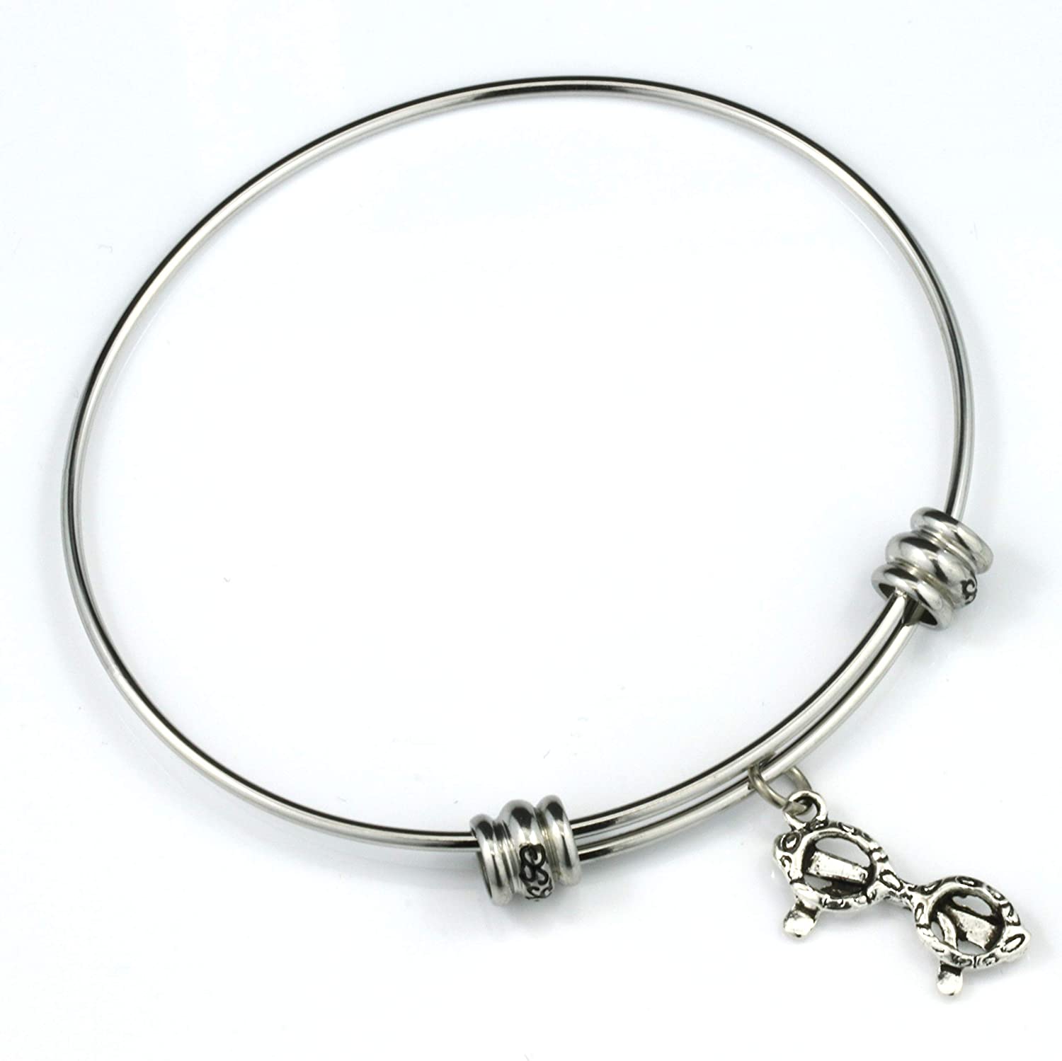 This Eye Glasses charm bracelet is perfect for the glasses lover. A great gift for a student of optometry or someone who just loves Eye Glasses. This adjustable stainless steel bangle has beautiful scrolled wrist protectors. Fashionable for any occasion and can be worn with any outfit or suit. Ready to be ordered and shipped to you by Amazon.