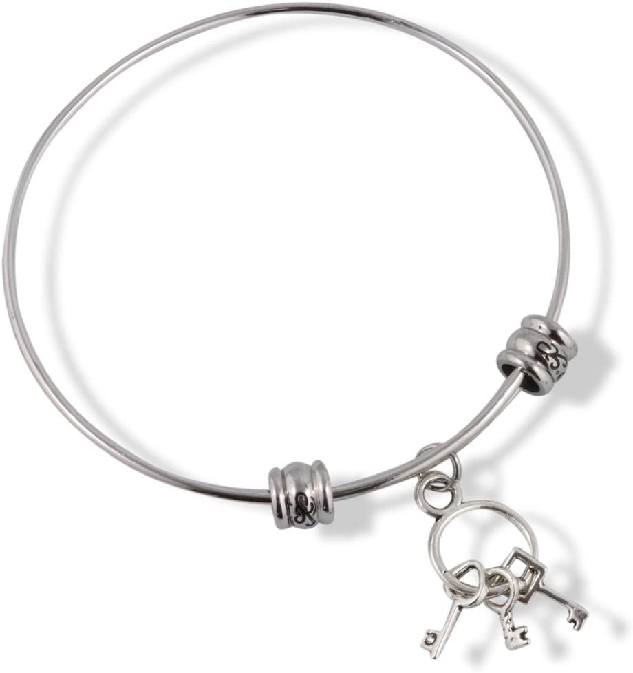 This Key Chain charm bracelet is perfect for the Key Chain lover. A great gift for a key master or someone who just loves Key Chains. This adjustable stainless steel bangle has beautiful scrolled wrist protectors. Fashionable for any occasion and can be worn with any outfit or suit. Ready to be ordered and shipped to you by Amazon.