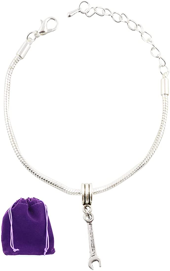 This Wrench charm bracelet is perfect for the Mechanic or fixer upper lover. A great gift for a car mechanic or someone who just loves Fixing Things. This adjustable Silver Plated Bracelet has a beautiful scrolled wrist protector and lobster clasp. Fashionable for any occasion and can be worn with any outfit or suit. Ready to be ordered and shipped to you by Amazon.